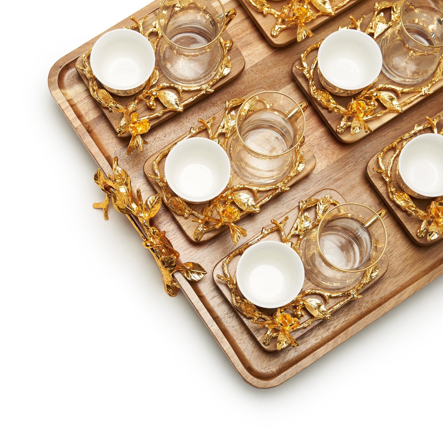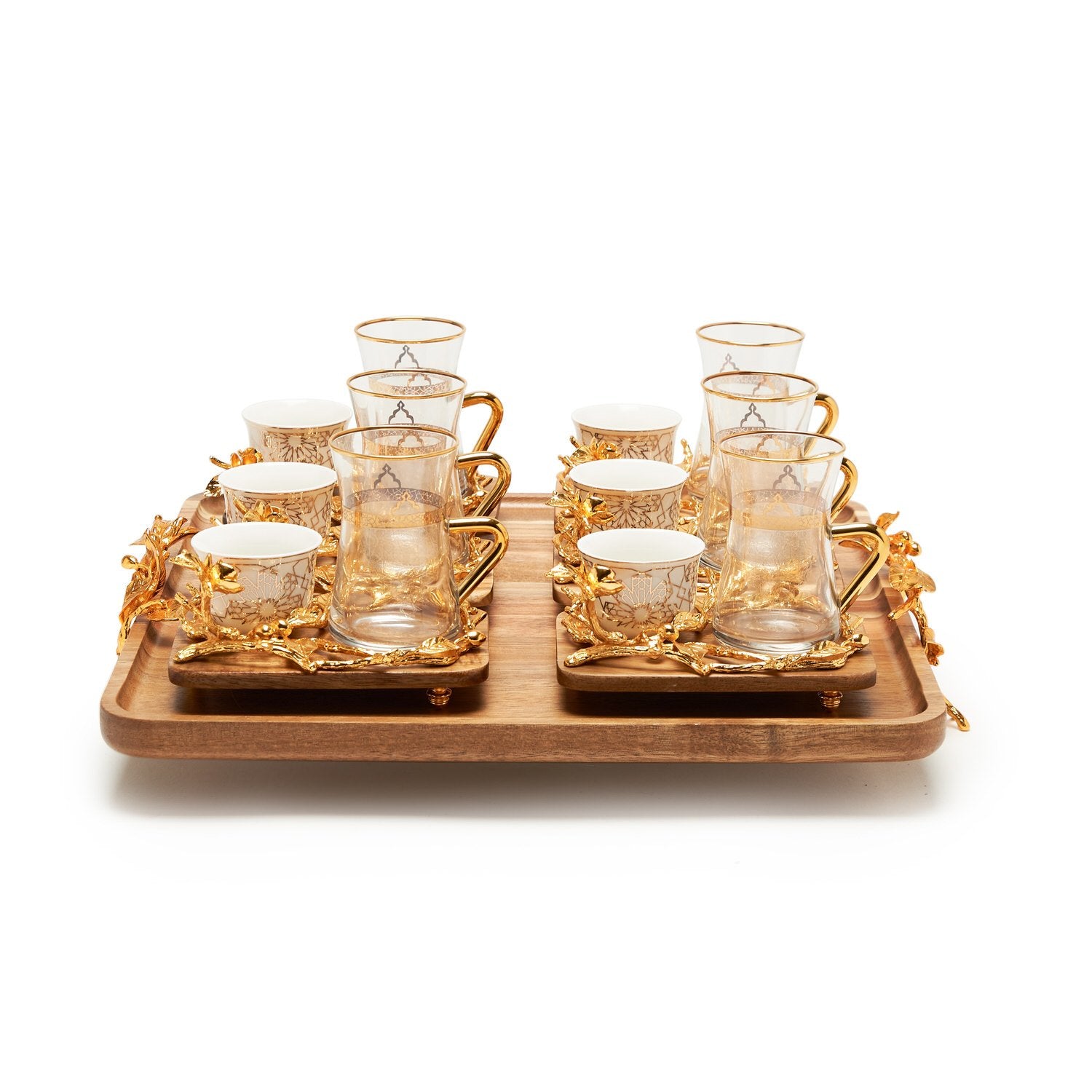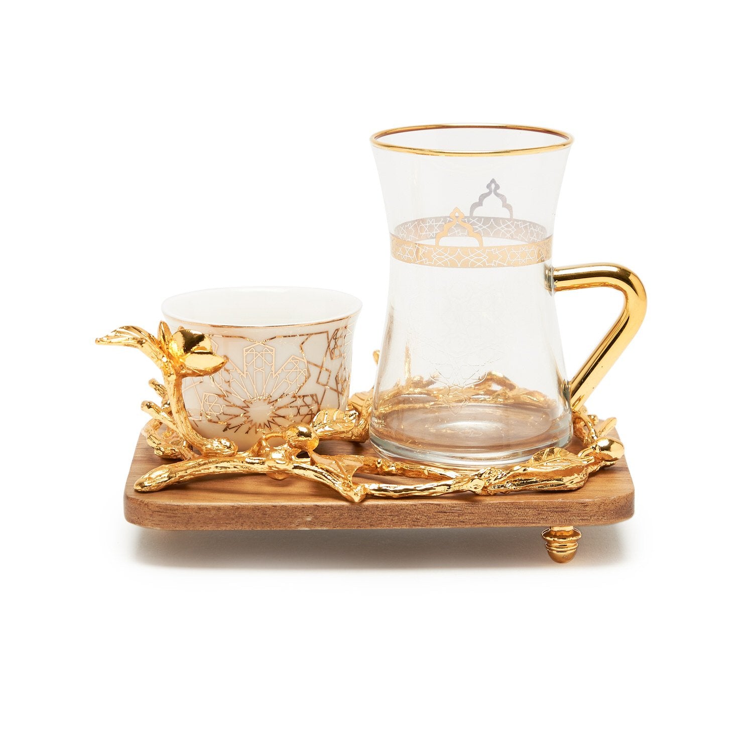 • مكونات المجموعة: 6 قطع من فناجين القهوة، 6 قطع من فناجين الشاي، 6 قطع من القاعدة الخشبية، 1 قطعة من الصينية