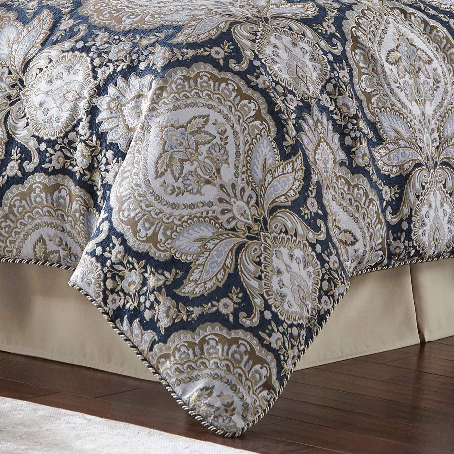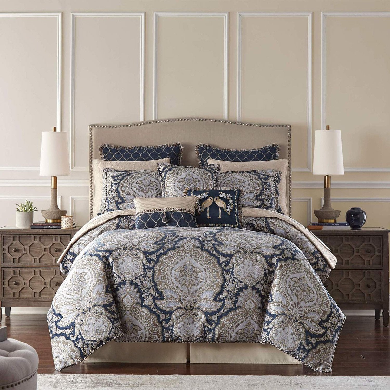 تتميز مجموعة مفروشات فالنتينا، المكونة من 8 قطع، بقماش دمشقي زهري فاخر مصنوع من قماش جاكار شينيل منسوج فاخر. يتألق اللحاف، المزين بأرضية بحرية جذابة، بمزيج فريد من الرمادي الناعم، والشمبانيا، والذهبي، والرمادي، ولمسات من الخزامى. أما أغطية الوسائد المتناسقة، فهي مزودة بحافة مزخرفة وسحاب للإغلاق.