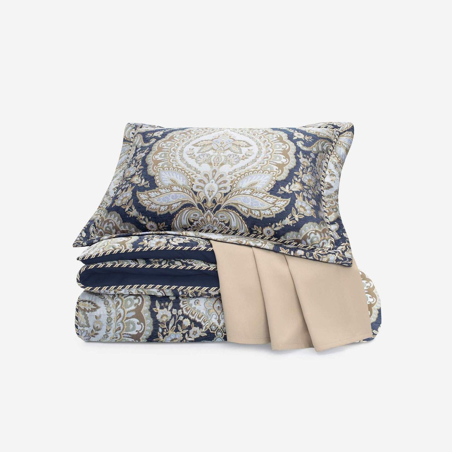 | 1 قطعة ملاءة مسطحة 274.32 سم × 259.08 سم | وسادة زخرفية واحدة 45.71 سم × 45.72 سم | 2 قطعة غطاء وسادة 101.6 سم × 53.34 سم |