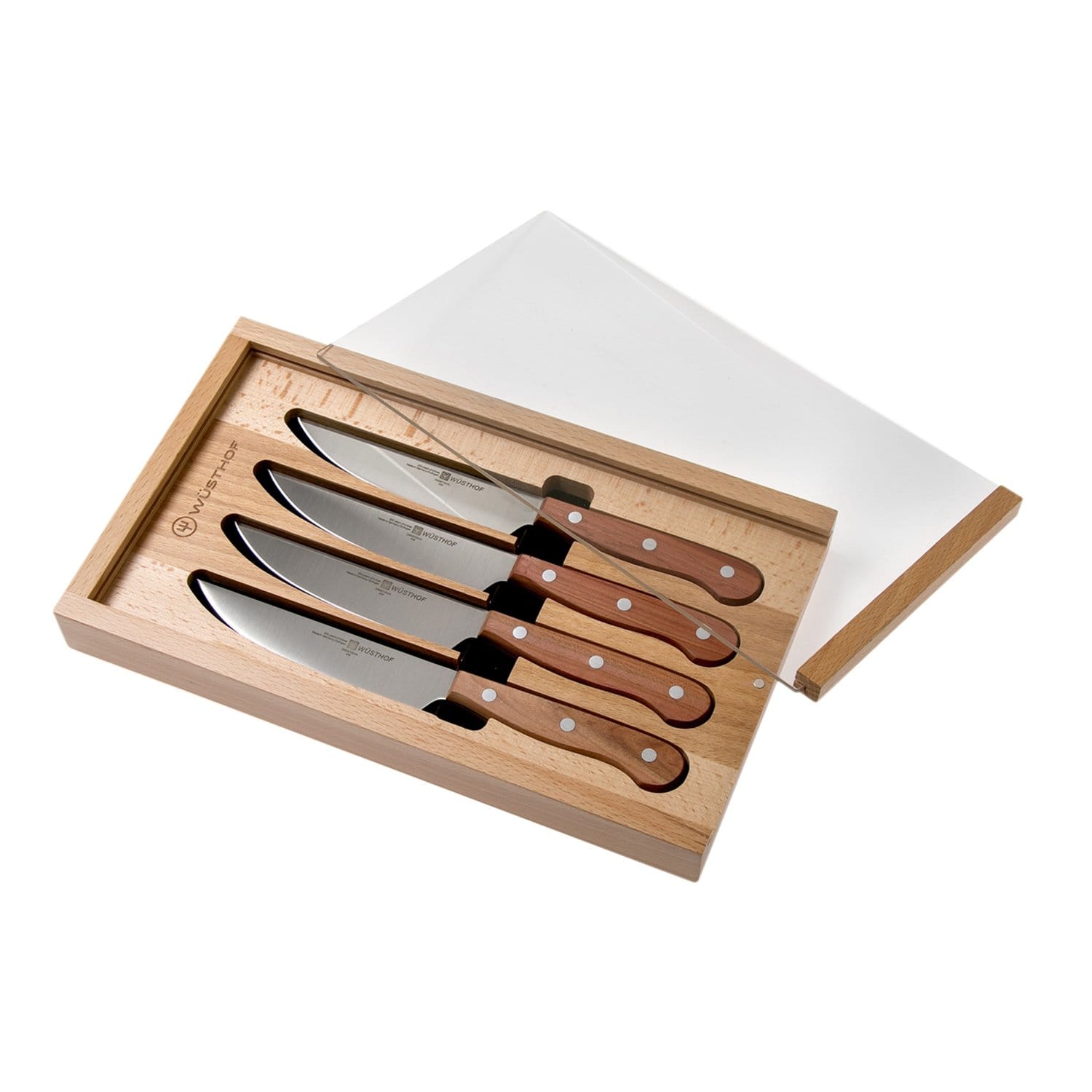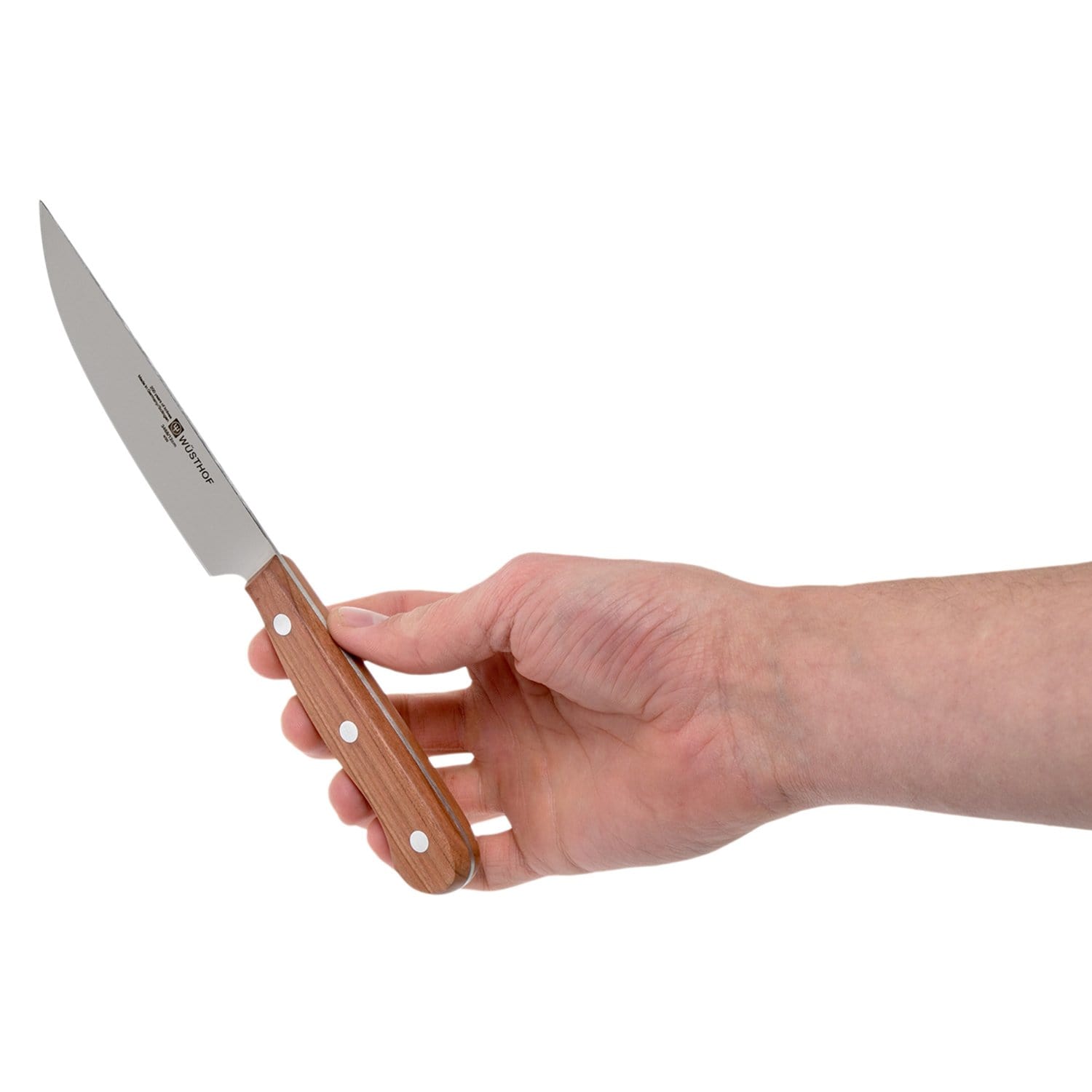 مجموعة سكاكين شرائح اللحم من Wusthof إضافة مثالية وعملية لمستلزمات مطبخك. تُمكّنك من تقطيع جميع الخضراوات والفواكه بدقة لتحضير وجبات شهية أو سلطات. تتميز المجموعة بتصميم حادّ لتقطيع دقيق، مما يضمن لك تحضير أطباق شهية في وقت قصير. يوفر مقبض السكين المتين ذو التصميم المُحيط قبضةً متينةً وموثوقةً لتقطيع سهل وفعال.